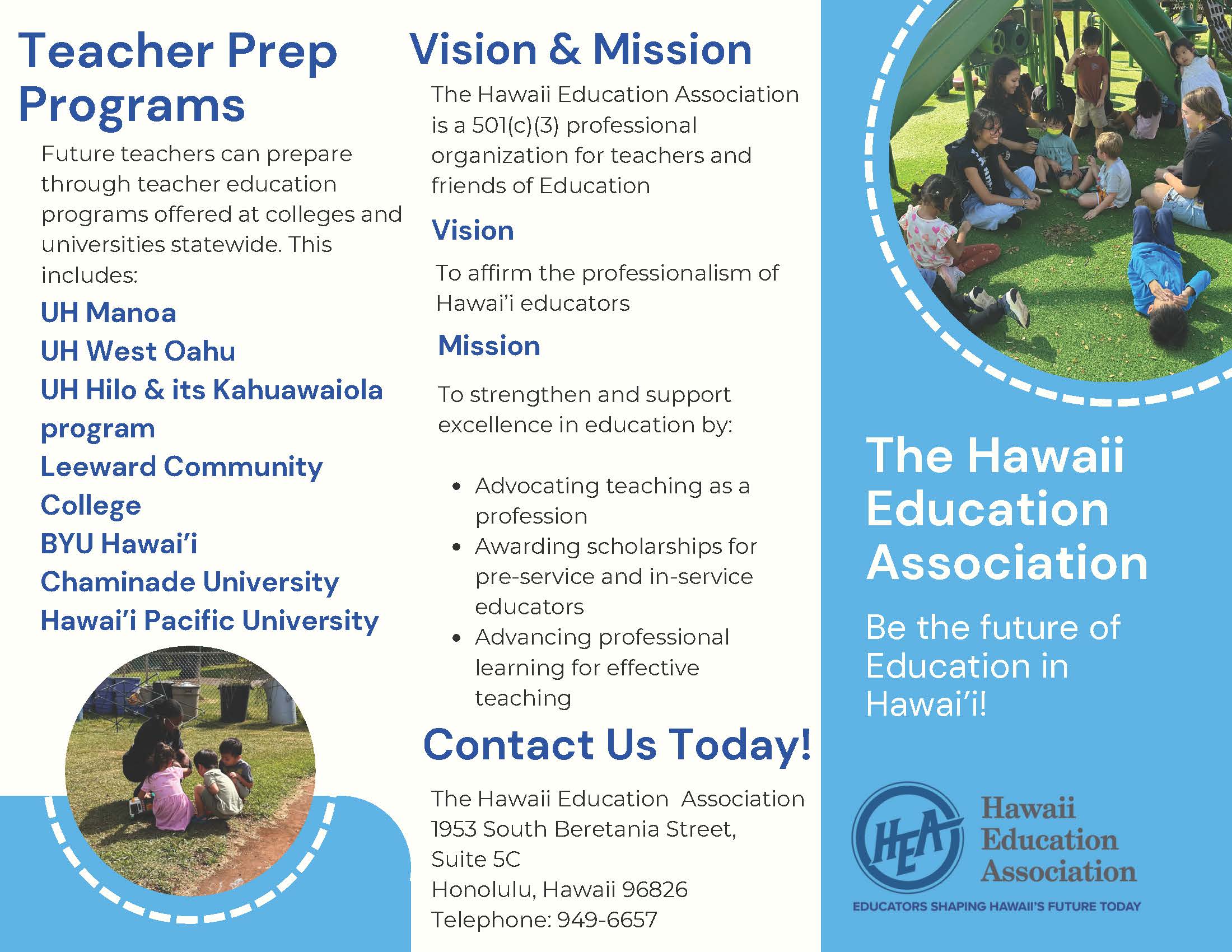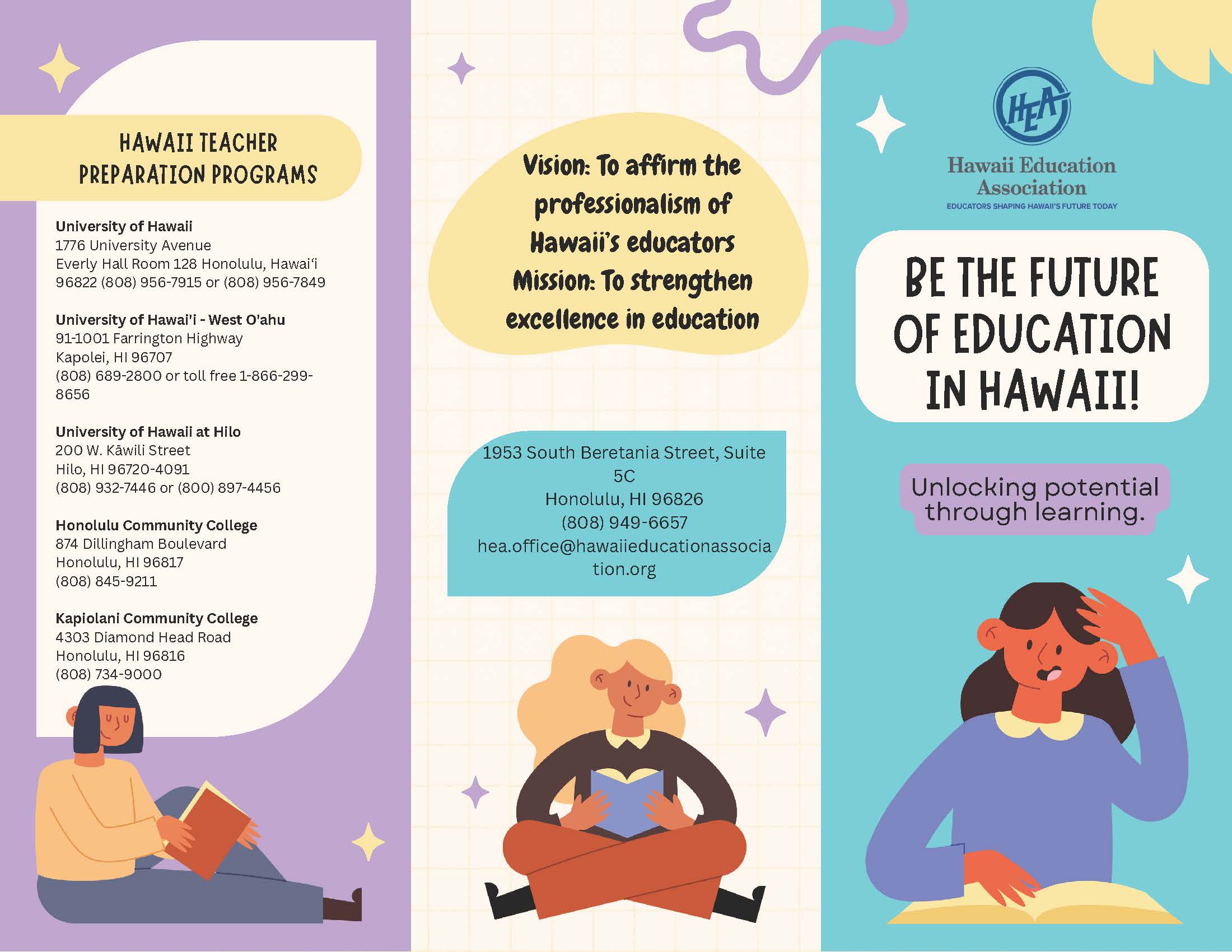 Congratulations to Mililani High School students, who swept the HEA contests to design Teaching As A Career brochures for middle and high school students! The contests were open to all schools that participate in CTE Education Pathways or have Teaching As a Career Clubs.