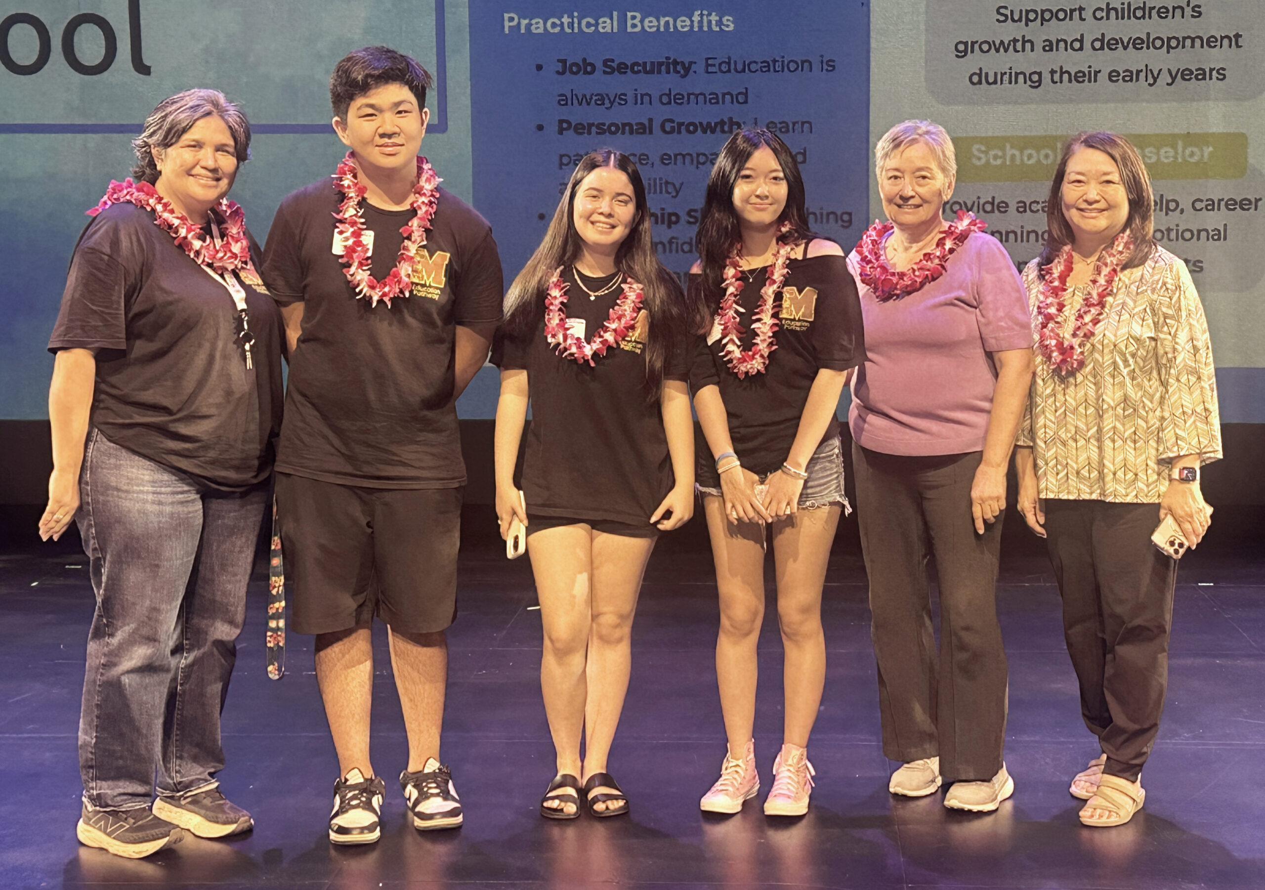 Kristen Kenney designed the winning brochure for high school students, and Jaelyn Mamiya and Ayden Felipe designed the winning brochure for middle school students. At the recent Dive Into Education event, Laurie Togami, HEA Executive Director, and Lynn Hammonds, Ed.D, Program Manager, presented the students and their advisor, Stephanie A Grande-Misaki, with $500 for their teaching programs. The funds were part of a State of Hawai‘i grant-in-aid grant.